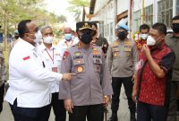 Kapolri Jenderal Listyo Sigit Prabowo meninjau vaksinasi massal para pekerja atau buruh pada hari ini, Kamis (29/7). Vaksinasi massal ini diselenggarakan oleh PT. Ching…